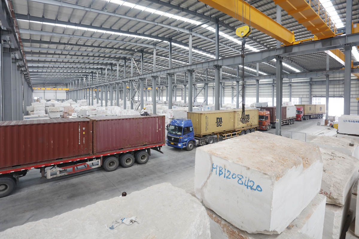振生石材采用世界先进的环保理念打造超大型室内荒料场。该荒料场实际面积为